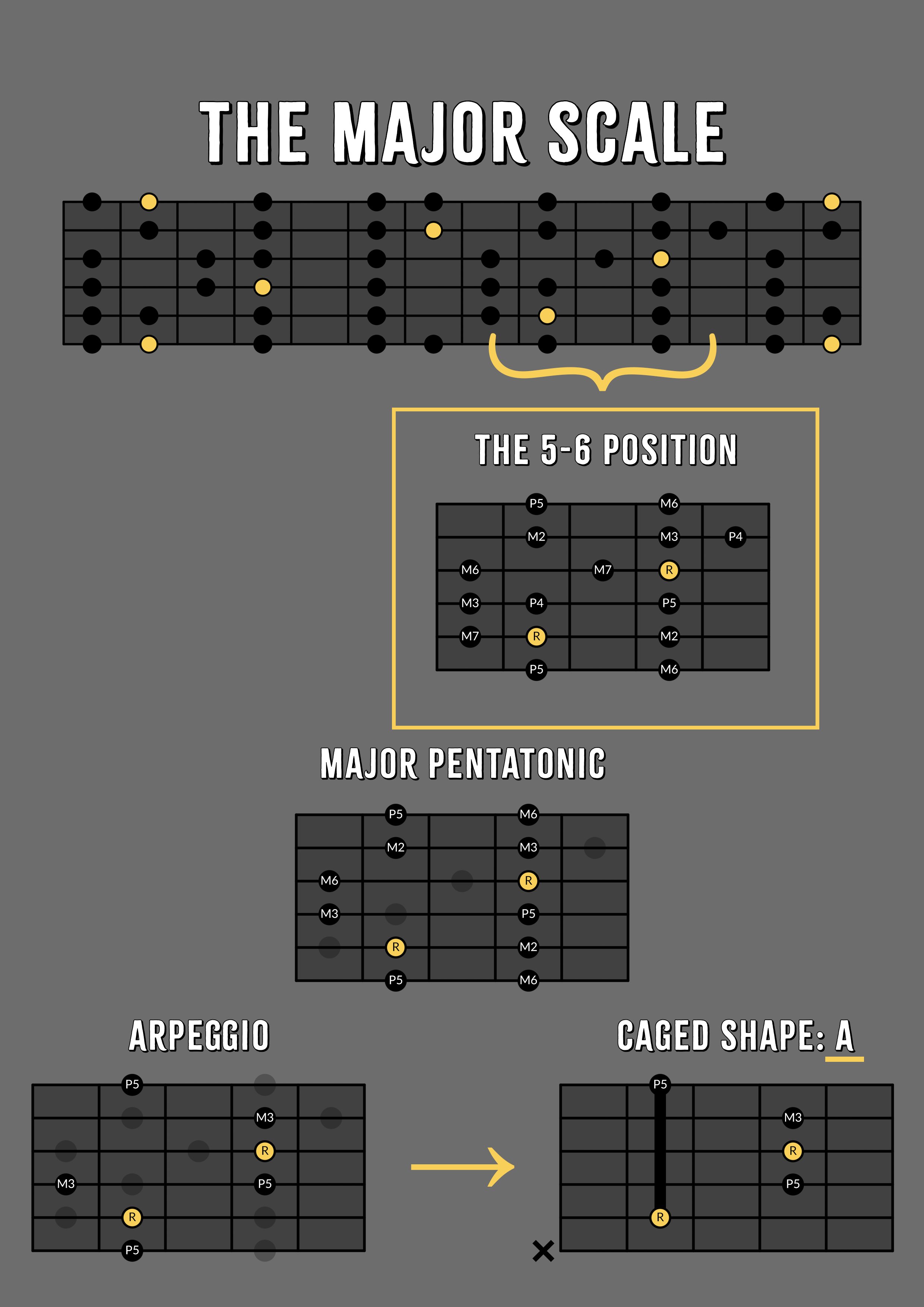 Guitar fretboard diagrams illustrating the major scale, 5-6 position, major pentatonic, arpeggio, and CAGED shape A on a grey background. Notes are marked with visual guides.